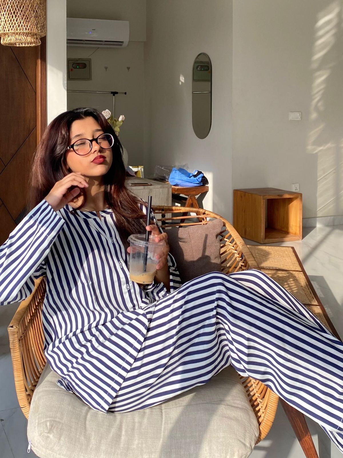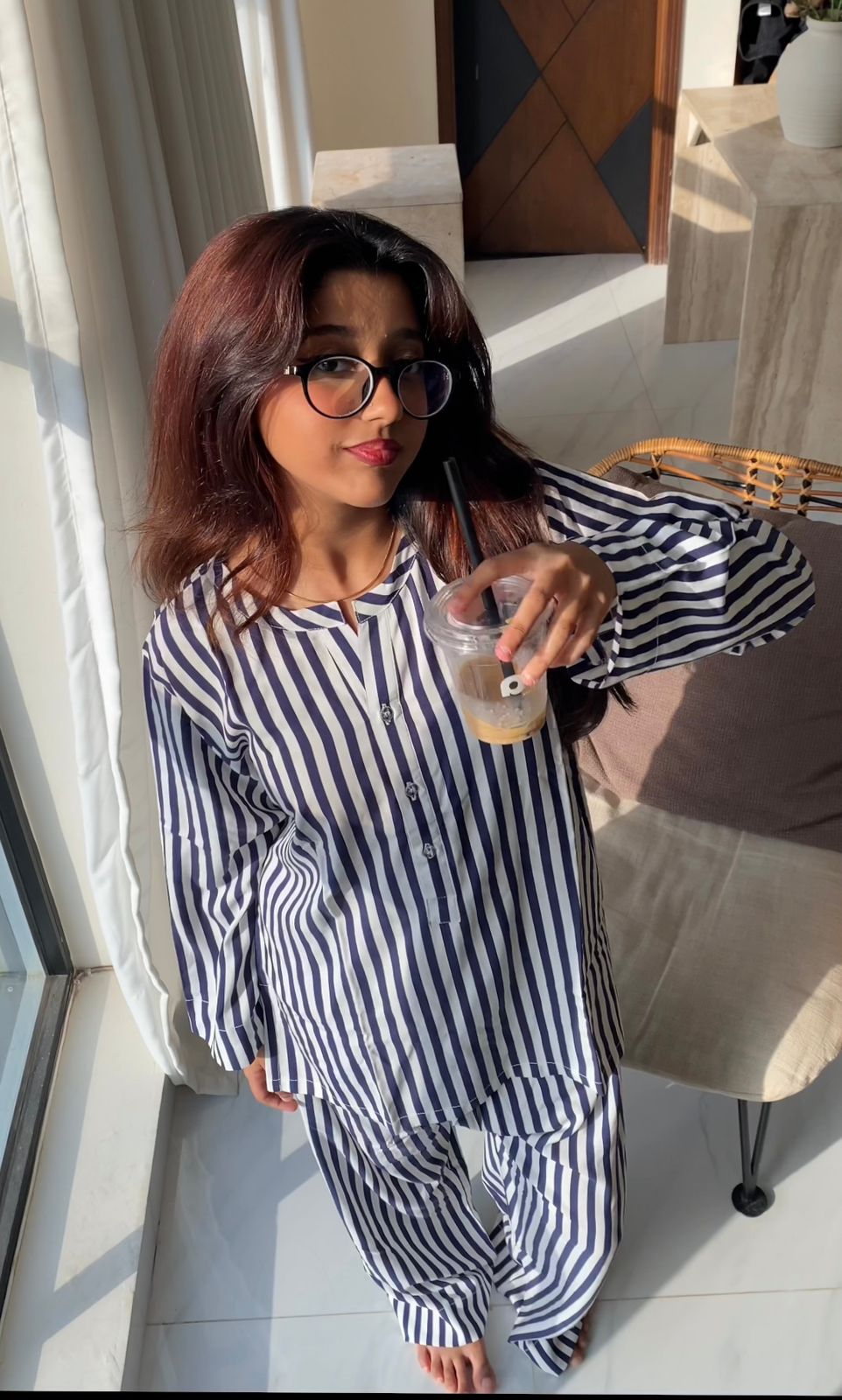 Blue Moon - Chill vibes in this comfortable navy blue & white striped pajama set. This outfit features a relaxed fit shirt and trousers in a classic navy and white stripe pattern. Crafted for ultimate comfort, its a must have!