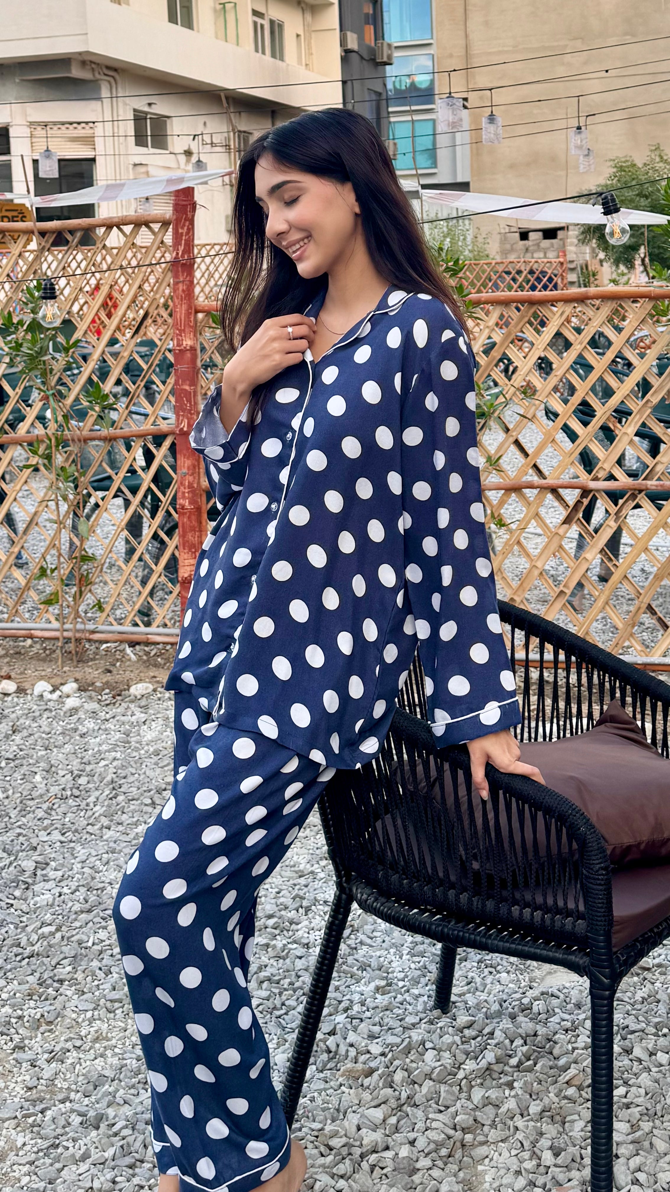 A charming two-piece pajama set featuring a deep navy base with playful white polka dots. The long-sleeve button down top is designed with a classic notched collar and contrast white piping. Its relaxed fit offers effortless comfort while maintaining a timeless silhouette. Crafted from soft, breathable fabric ideal for lounging and restful sleep.