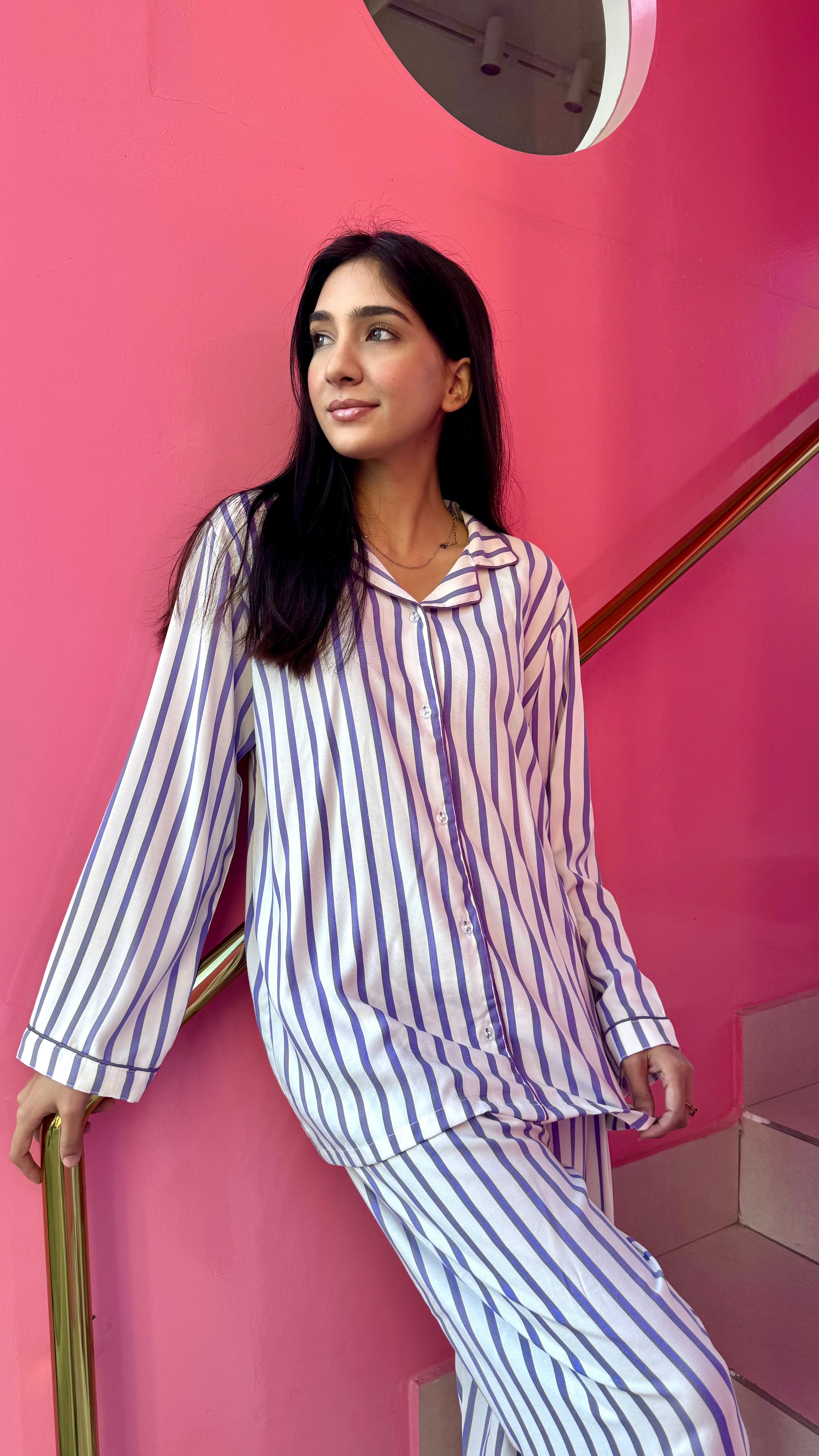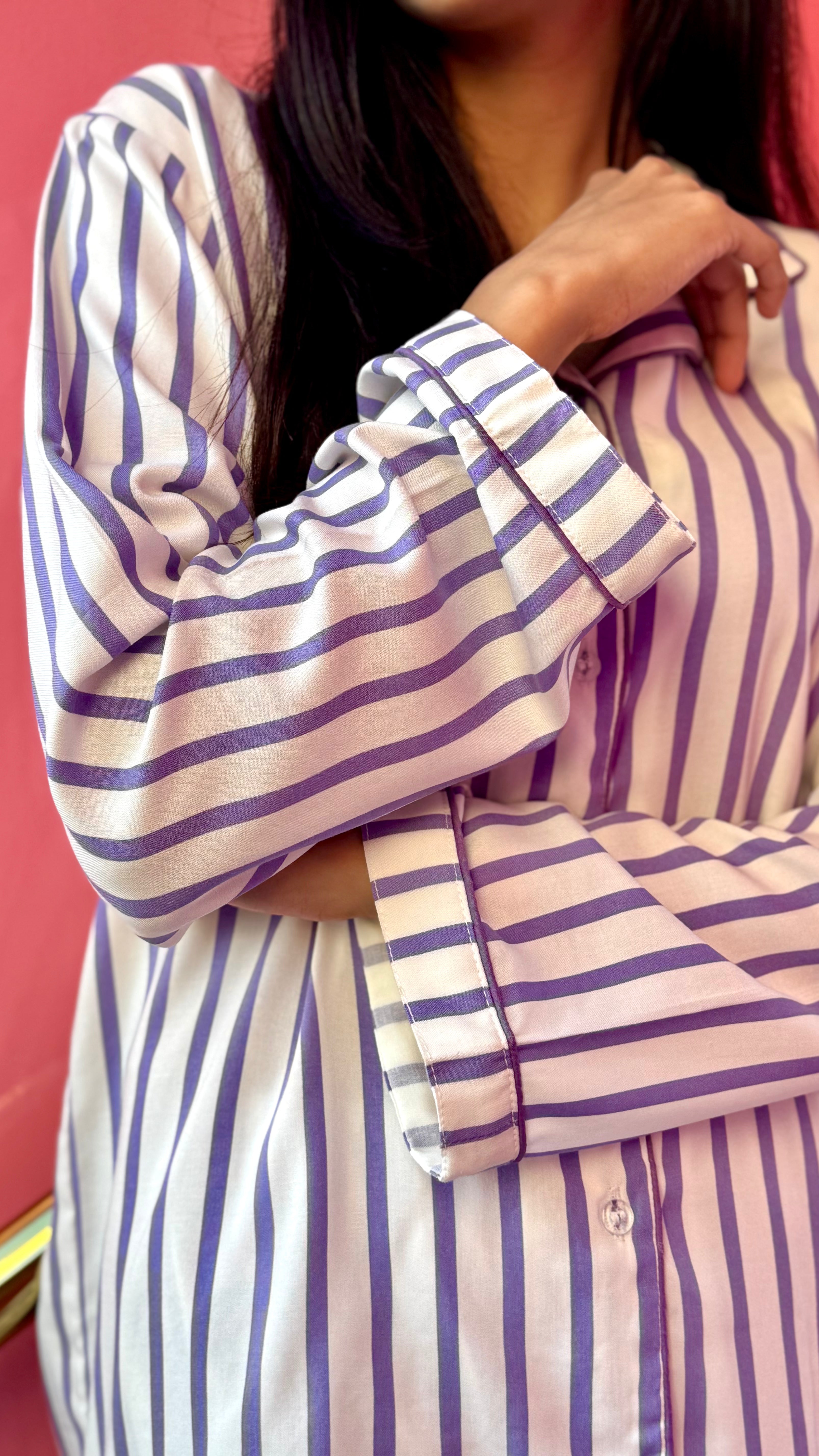 A classic two piece pajama set in mauve and white vertical stripes. The long sleeve button down top features a relaxed silhouette with a notched collar. Subtle contrast piping adds a polished finish along the edges. Crafted from a lightweight, breathable fabric for everyday lounging and sleep.